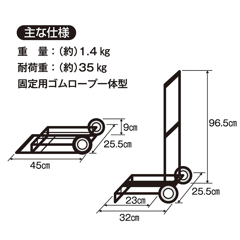 主な仕様 収納サイズ:45×25.5×9cm 使用サイズ:96.5×25.5×32cm 重量(約):1.4kg 耐荷重(約):35kg 固定用ゴムロープ一体型
