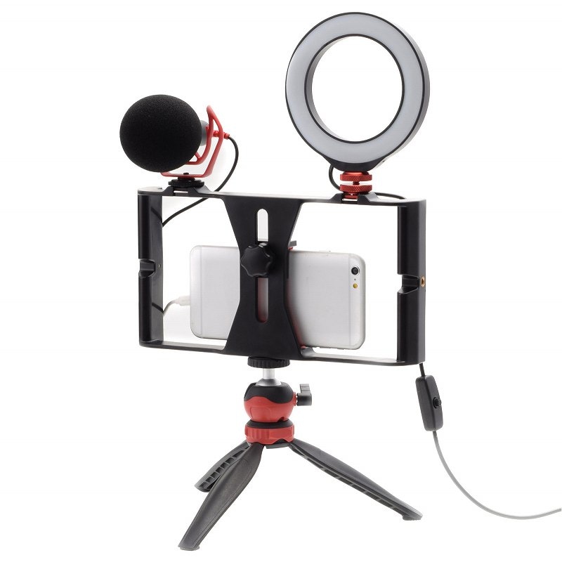 リグをベースに、マイク+LEDライト。簡単キレイにVlog撮影!! 2つのシューマウントと、3つの三脚ネジ穴を備えた、VLOG制作便利ツールです。LEDライトとビデオマイクをマウントできます。