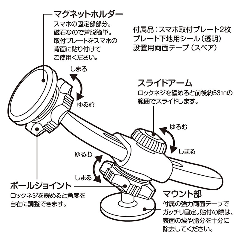 付属品:スマホ取付用金属プレート/2枚・取付プレート用下地用シール・設置用両面テープ(スペア)
