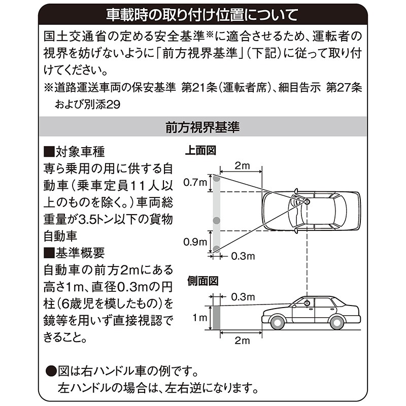 ※車載でご使用になる際の設置位置については、国土交通省の定める安全基準に適合するよう「前方視界基準」に従って設置してください。(製品画像10枚目・製品の取扱説明書に記載)