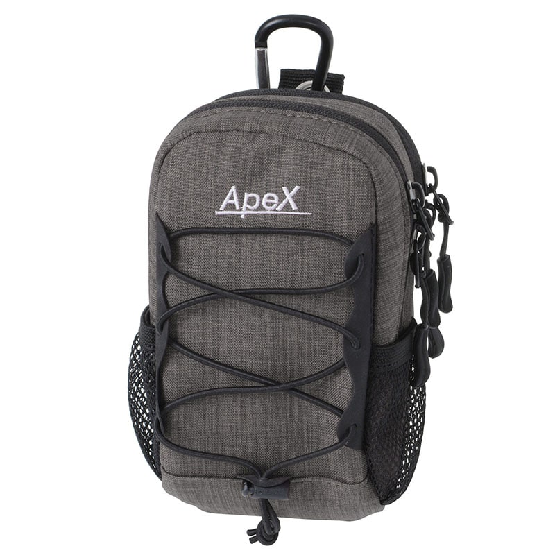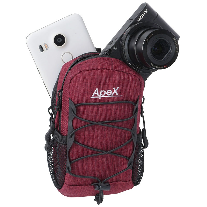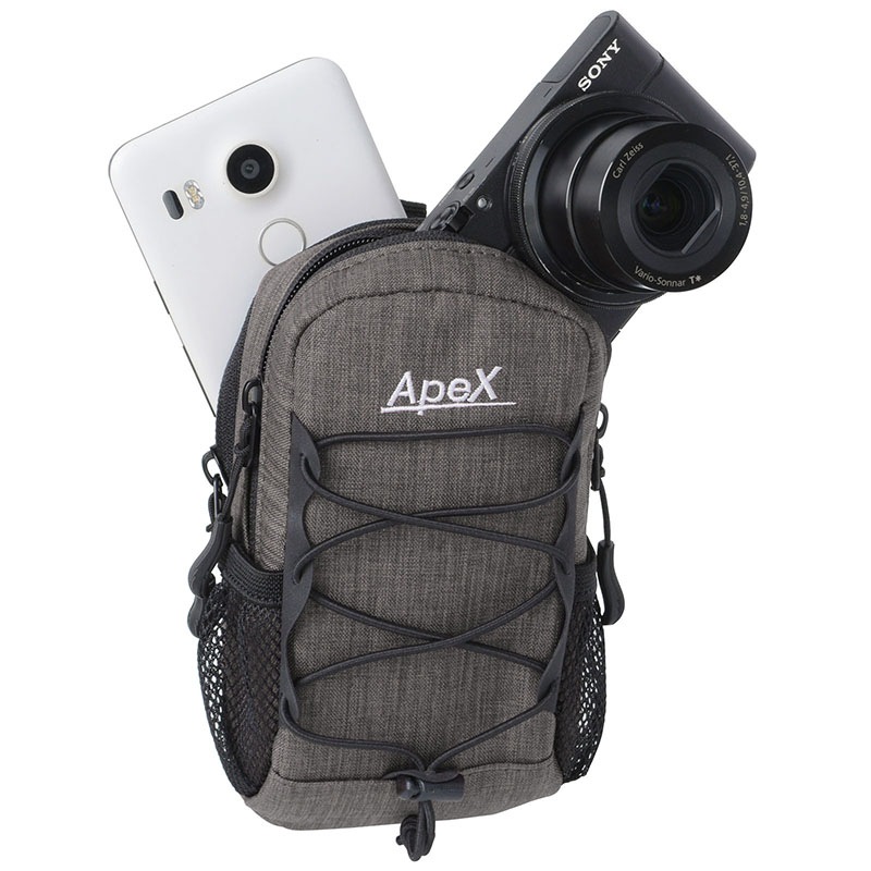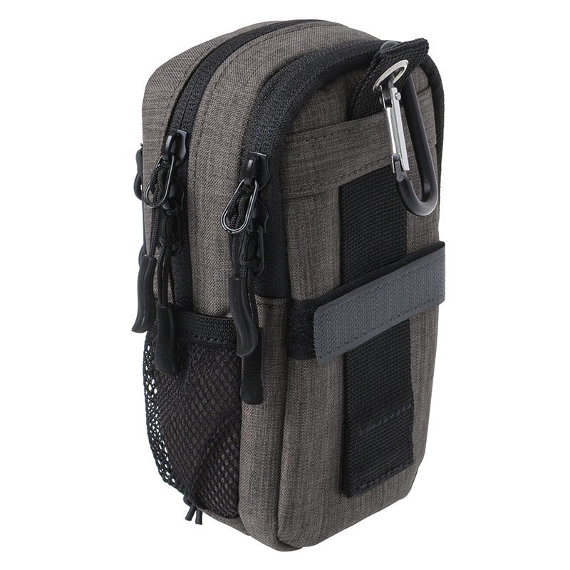 コンパクトデジカメ・ガジェット類を保護する機能性重視のカメラポーチ。収納部はカメラとスマホが各1台収納できるダブルポケットで、ファスナーは左右どちらからでも開閉できる使いやすいダブルファスナー仕様。メインポケットには高級コンパクトカメラやアクションカメラを収納できるスペースを確保。サブポケットにはスマートフォン(最大でiPhone XRに対応)やモバイルWi-Fiルーターを収納。また、製品正面のバンジーコードにはミニ三脚など小物類を固定でき、両サイドのメッシュポケットには小型のアクセサリー類が収まります。取付は背面の縦横方向どちらでも対応できる2本のベルトループ、または付属のカラビナで。選べる4色から。