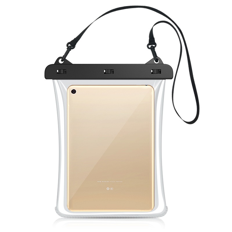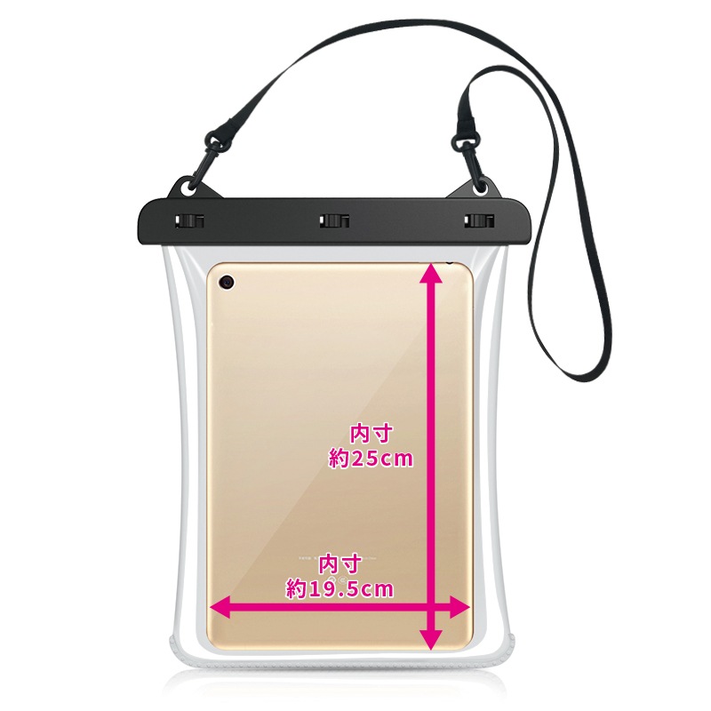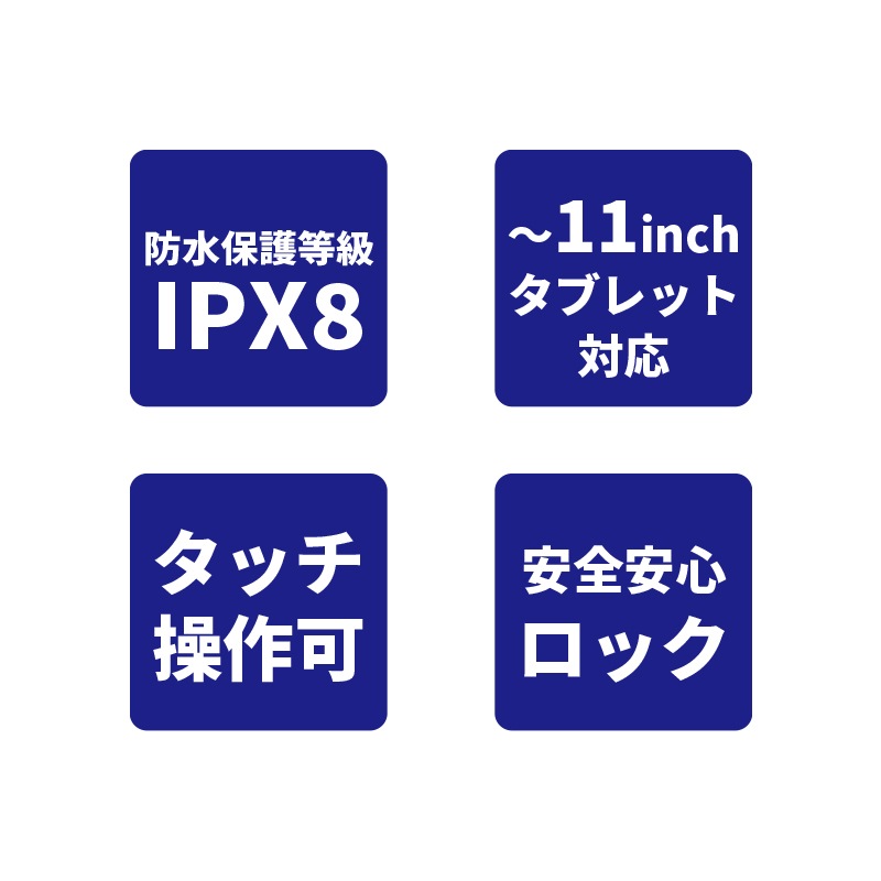 オールシーズン対応!タブレット用『防水ポーチ』。外では海、プールやウインタースポーツ、お家でもポーチに入れたままタッチ操作ができるので、キッチンやお風呂などの水回りで、水を気にすることなくタブレットを使用できます。
