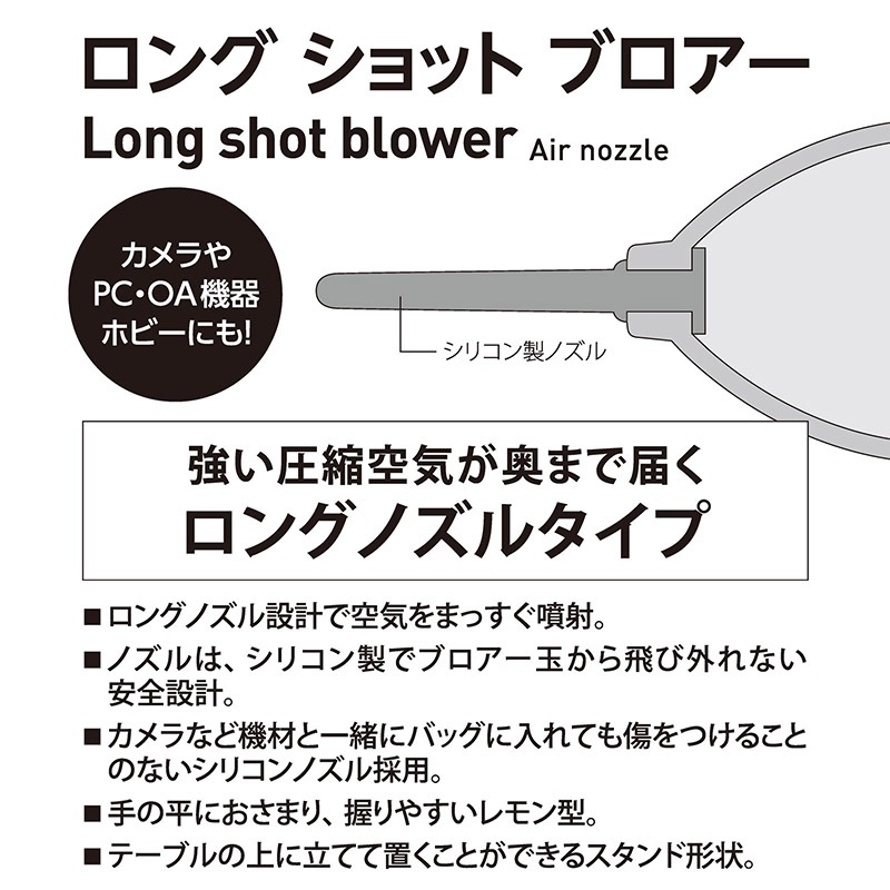 本体もノズルもソフトなシリコン製で、機材を不用意に傷付けないハンディータイプのブロアー。狙ったところへワンショット!エアーが奥まで届くロングノズルタイプ。カメラ・PC・OA機器・ホビーまで幅広く活躍。