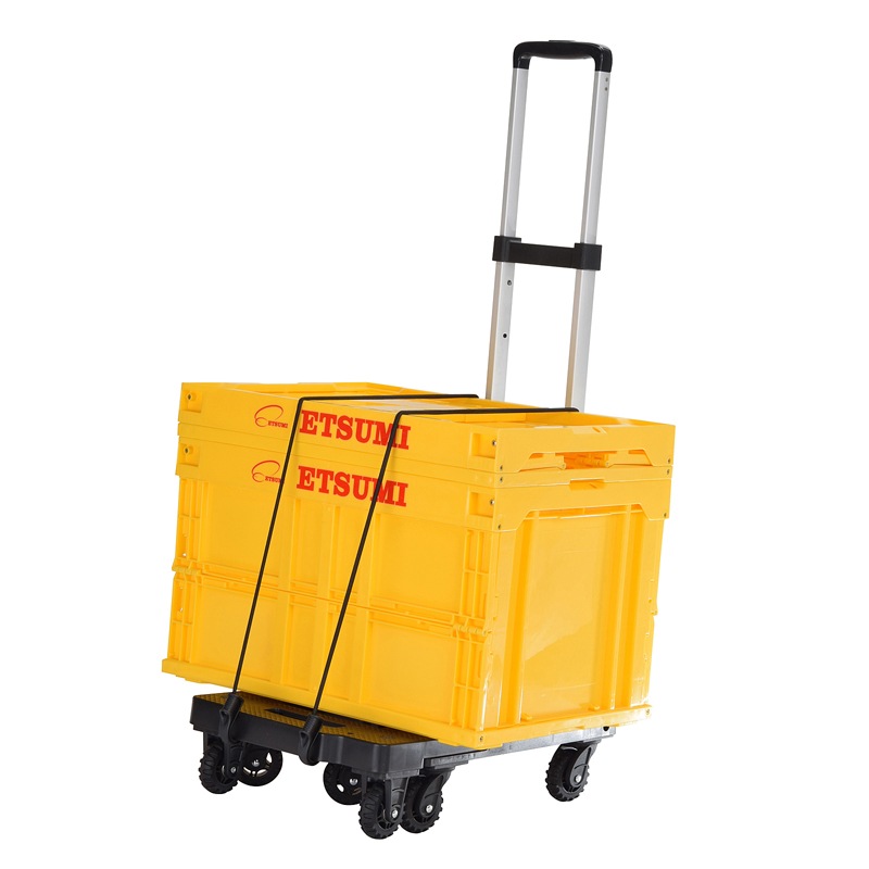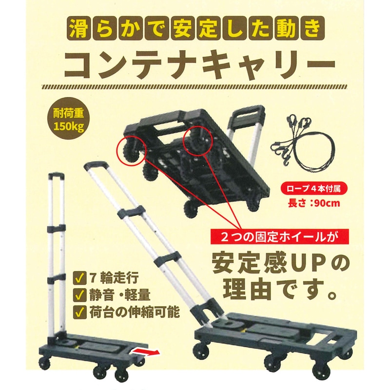 ベースキャリー/キャリーカート/手押し台車と用途に合わせて使えるコンテナキャリー。7輪走行により、なめらかで安定した動きを実現。耐荷重150kgの堅牢設計ながら、重量は3.3kgと軽量です。荷物に合わせて荷台の伸縮も可能。固定用フックロープは4本付属です。