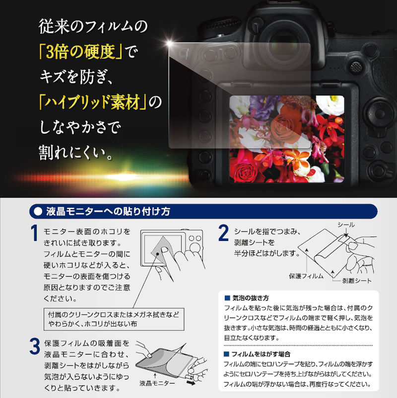 デジタル一眼用液晶保護フィルムの新機軸。ガラスと変わらない硬度9Hとフィルムのしなやかさを両立するハイブリッド素材を採用しました。