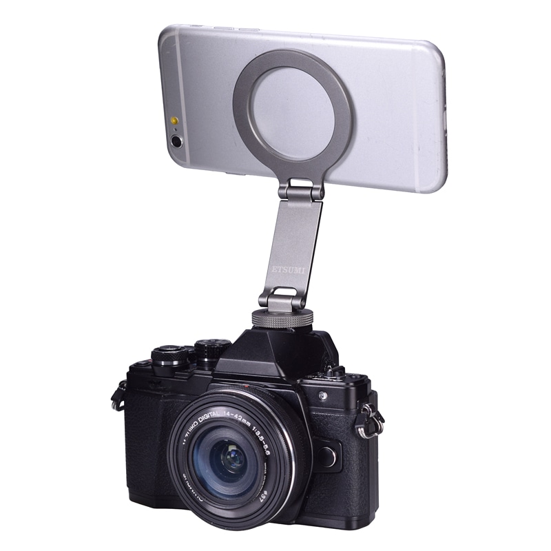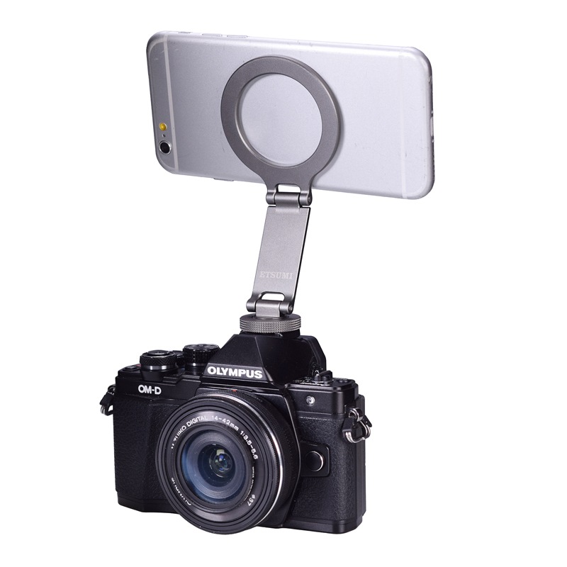 スマートフォンの着脱が素早く簡単にできるマグセーフ対応シューコネクター。カメラのホットシューに取り付けてカメラ+スマホの同時撮影やモニター代わりに。底面は1/4インチネジ穴で三脚への取付けも可能。