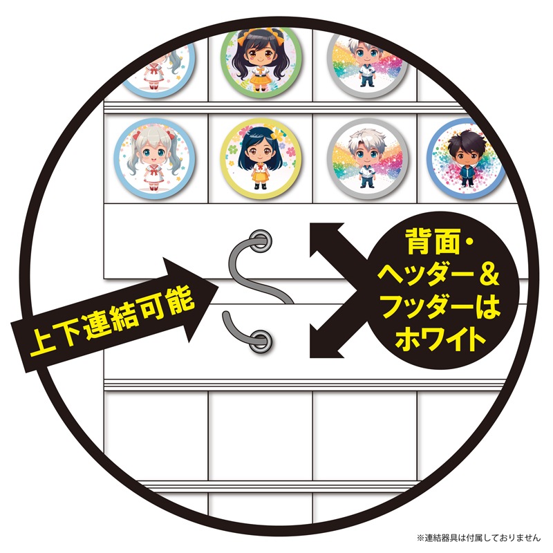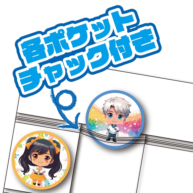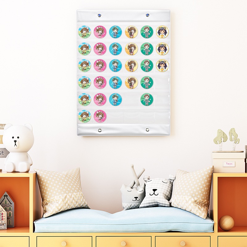 58mm以下の缶バッジが横6個×縦6段の36個収納できる壁掛けポケット。ホコリの入りにくいチャック付きポケット。上下に連結も可能です。